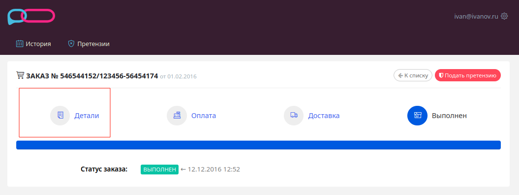 Просмотр деталей заказа: для ознакомления с информацией о заказе разверните