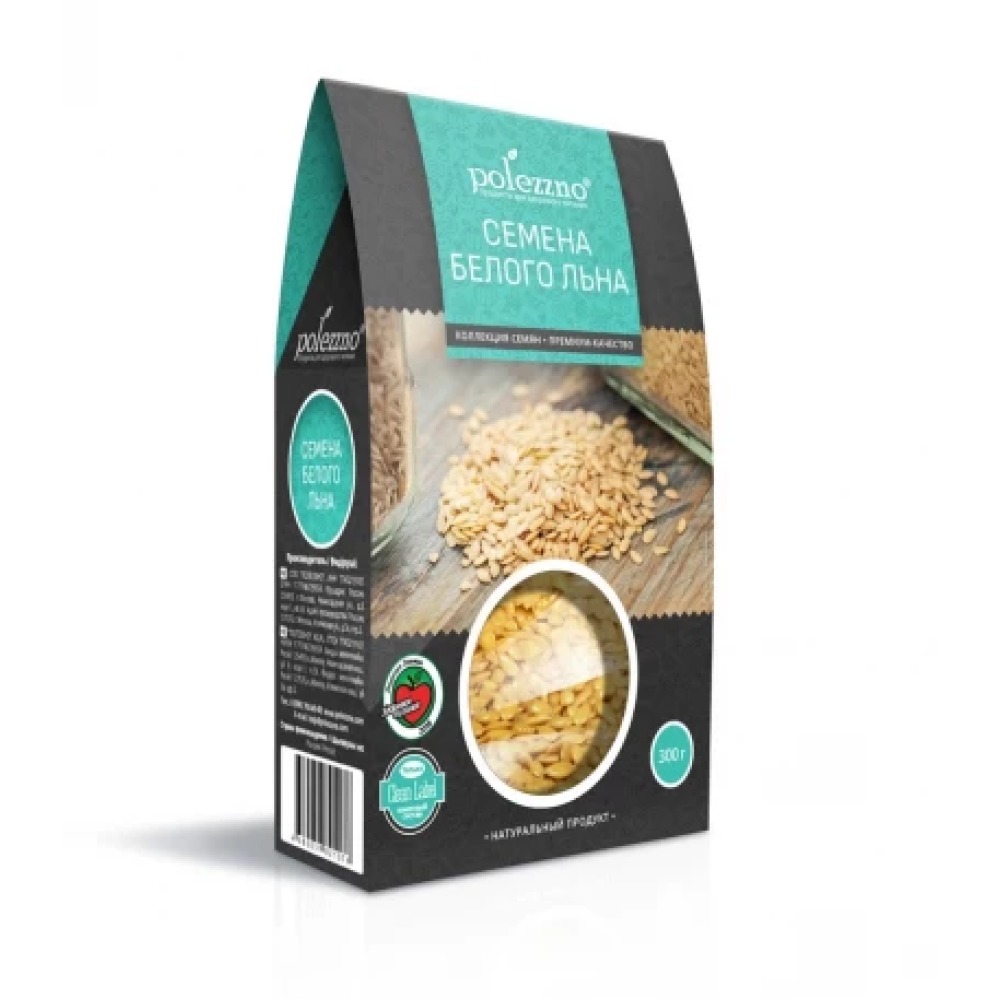Cемена белого льна в фасовке под торговой маркой POLEZZNO. Белый лён - особый сорт пищевого льна, отличающийся более высоким содержанием фитолигнанов – веществ, схожих по своему действию с женскими гормонами - эстрогенами.